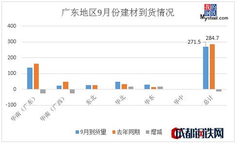 4、9月份廣東地區(qū)建材實際供應量271.5萬噸,同比減少13.2萬噸;10月份計劃到貨量307.5萬噸,跟上月相比增加36萬噸,跟去年相比增加2.4萬噸;